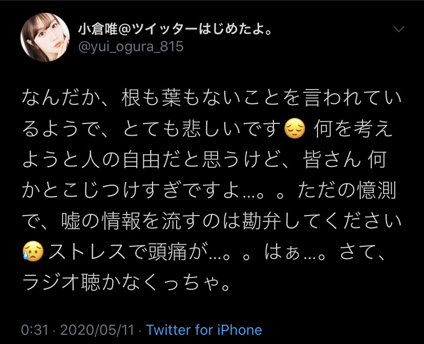 — 小倉唯@ツイッターはじめたよ。 (@yui_ogura_815) May 10, 2020