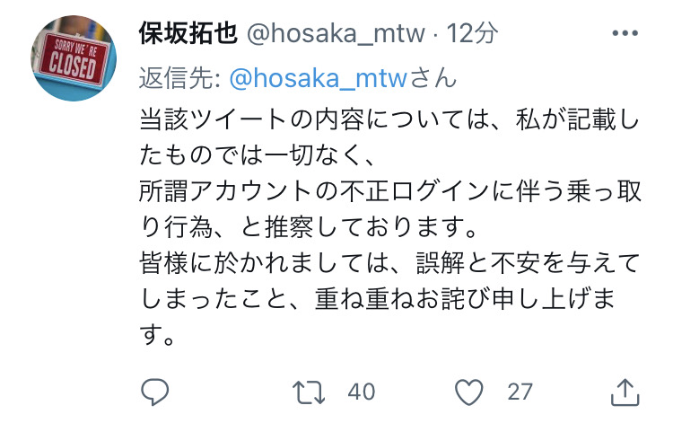 犯人が乗っとってあのツイートしてすぐツイ消ししたのか…