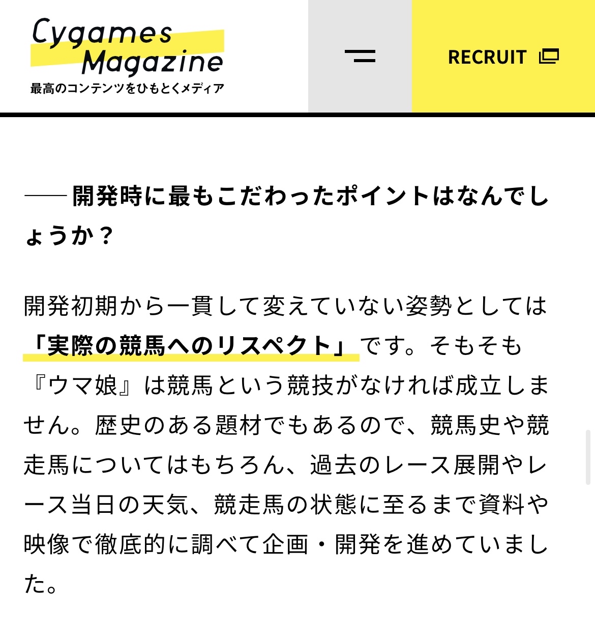 サイゲ「開発初期から一貫して変えていない姿勢としては「実際の競馬へのリスペクト」です。そもそも『ウマ娘』は競馬という競技がなければ成立しません。歴史のある題材でもあるので、競馬史や競走馬についてはもちろん、過去のレース展開やレース当日の天気、競走馬の状態に至るまで資料や映像で徹底的に調べて企画・開発を進めていました。」