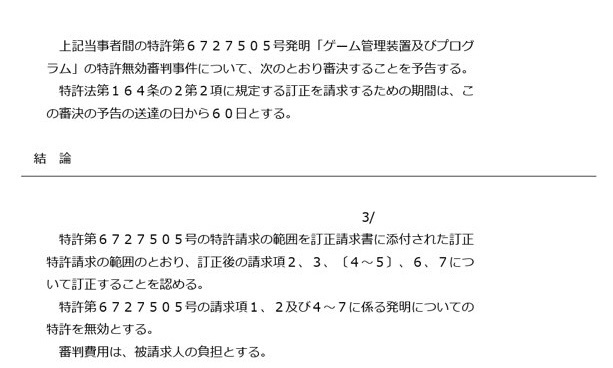 コナミの特許を逆に無効審判請求して受理されとったみたいや