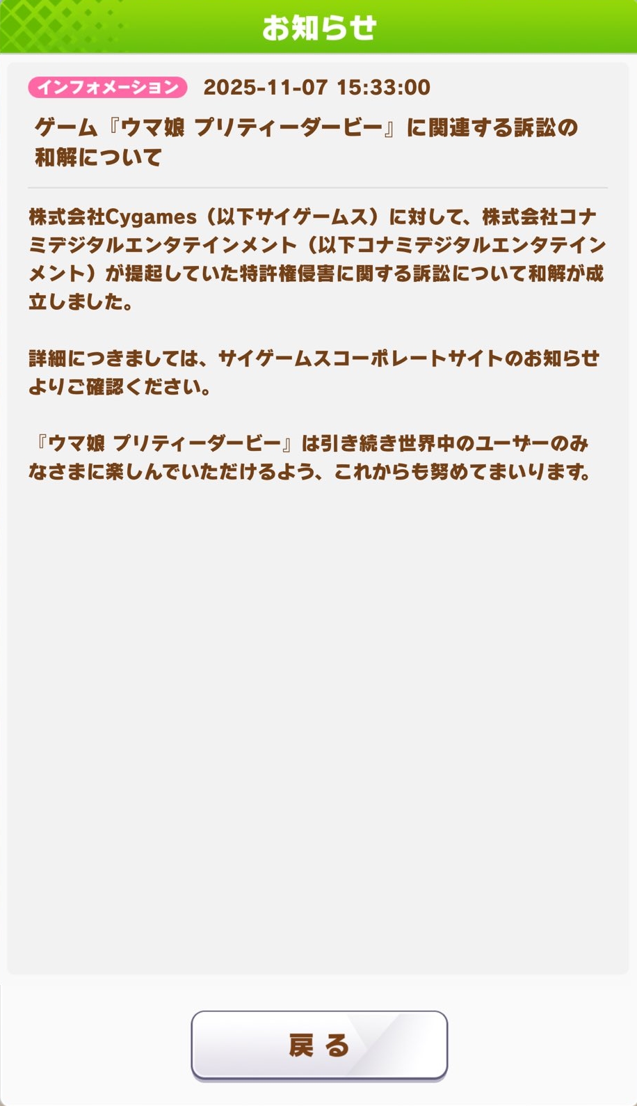 そもそもコナミがウマ娘のサービス差し止め求めて訴訟起こしてるのにその目的が達成できなかったのは確定