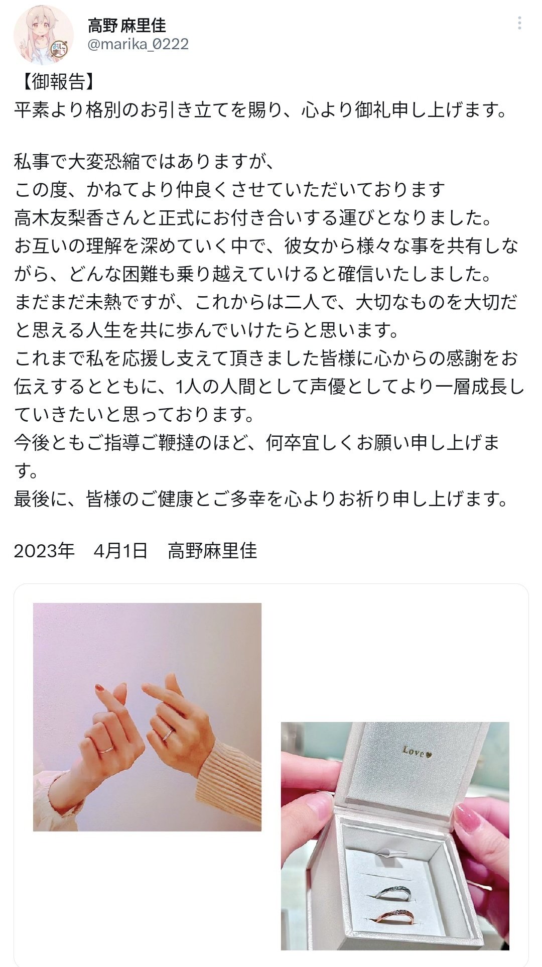 声優の高野麻里佳さん、高木友梨香さんと交際報告