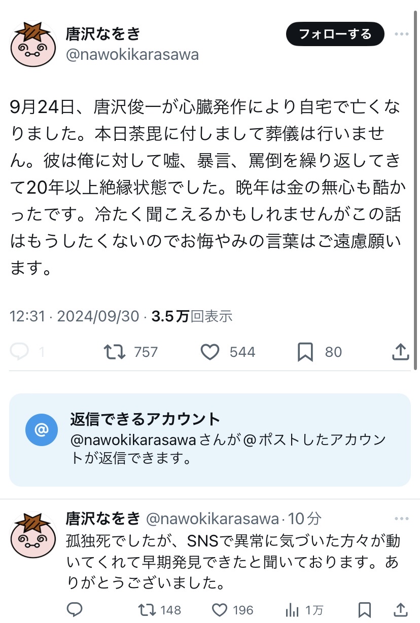 唐沢俊一、死去 享年66 24日に心臓発作 コラムニストで弟の唐沢なをき氏は漫画家 2024年10月01日 カテゴリ:漫画・アニメ雑談 【唐沢俊一、死去 享年66 24日に心臓発作 コラムニストで弟の唐沢なをき氏は漫画家】の続きを読む タグ :#漫画家#唐沢なをき#コラムニスト#心臓発作#心臓#発作#死去#唐沢俊一
